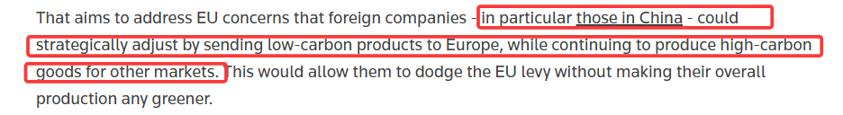 此举旨在消除欧盟担忧,即外国公司——尤其是中国公司——可能会通过战略性调整,将低碳产品销往欧洲,同时继续为其他市场生产高碳产品。这将使它们能够规避欧盟的碳税,而无需使其整体生产更加环保。
